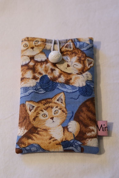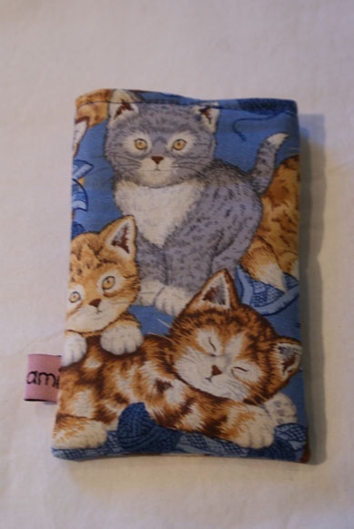 Hovedstoffet er blått i bunnfarge med motiv av nydelige grå, beige og brune katter.