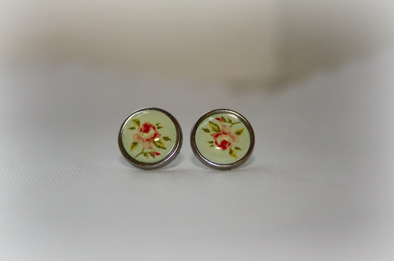 Små øredobber i mintgrønn farge.De er dekorert med et søtt rosemotiv.