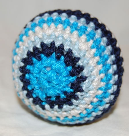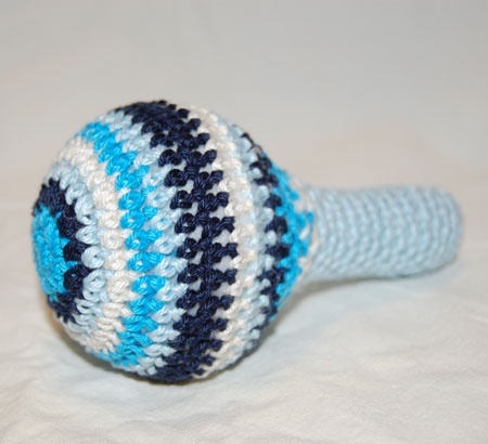 Babyrangle inspirert av 1970-tallet, heklet i bomullsgarn i ulike farger. Ranglen er fylt med fiberfyll, og har en liten bjelle inne i seg.