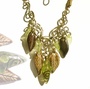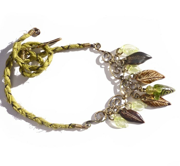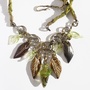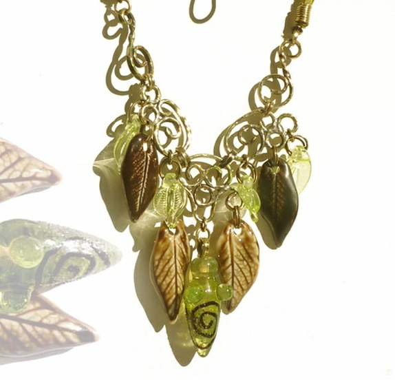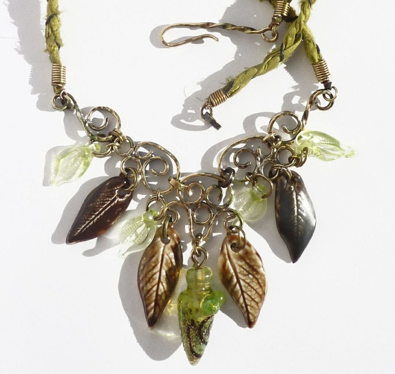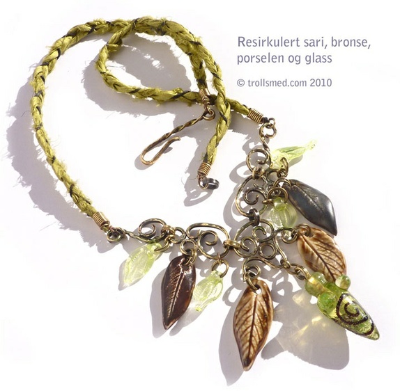 Herlig smykke med mine egne håndlagde lampworkperler og gudinne, håndlagde porselensløv, håndlaget bronesesnurr og resirkulert sari som kjede. Smykket henger godt på brystet og er helt unikt.Et av mine egne favoritter.