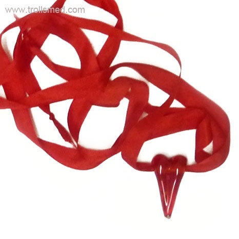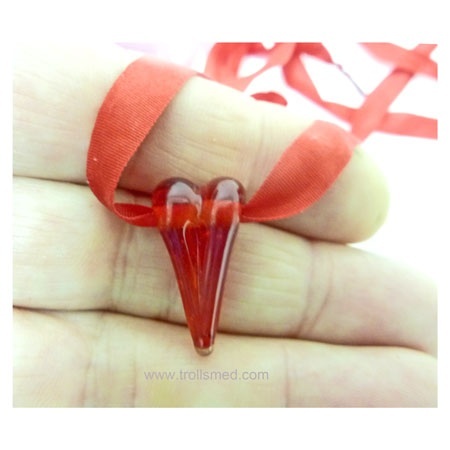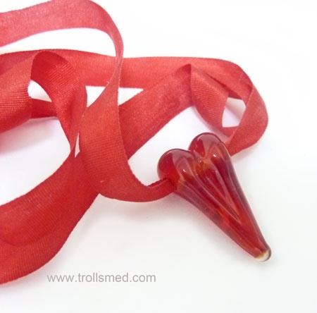 Et lite nydelig håndlaget rødt lampworkhjerte, ca 2 cm. Det henger i ekte mykeste, letteste silke (ikke nylon) snor som du knytter i nakken.