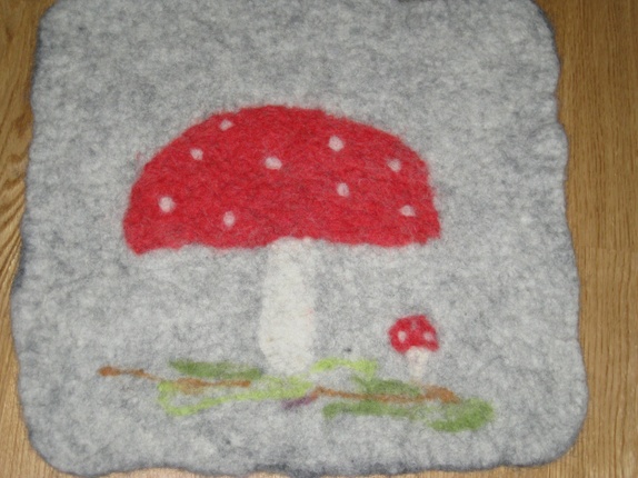 Motivet er en fluesopp.Sitteunderlaget er tovet i 100% ull fra Vestlandet.Det måler ca 40x40cmDet varmer godt, både på tur i båten, på fjelltur sommer og vinter, i en kald bil - overalt der du trenger litt varme bak.
