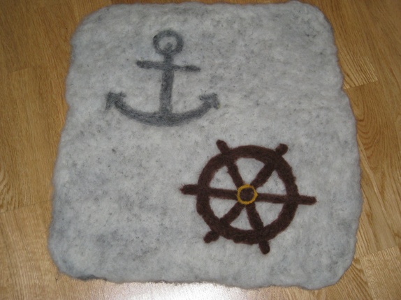 Motivet er anker og båtrattSitteunderlaget er tovet i 100% ull fra Vestlandet.Det måler ca 40x40cmDet varmer godt, både på tur i båten, på fjelltur sommer og vinter, i en kald bil - overalt der du trenger litt varme bak.