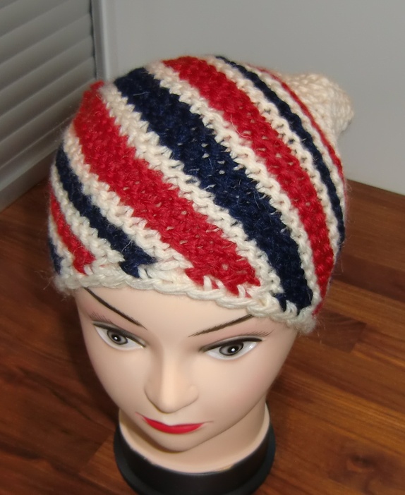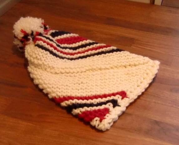 Luen har offwhite som hovedfarge, ispedd med striper i rødt og blått.