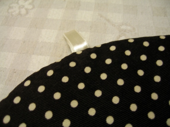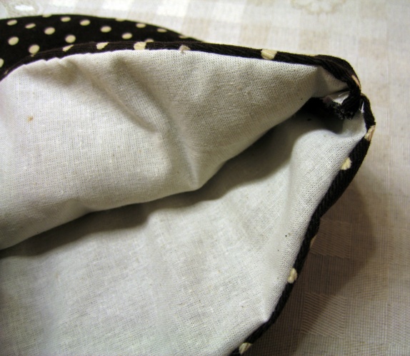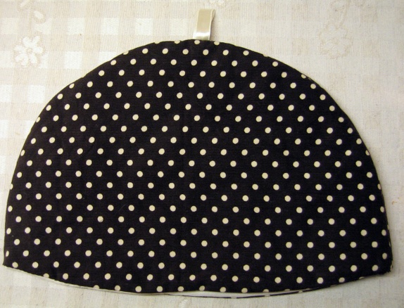 Søt tekannevarmer i hvitprikket brun cordfløyel.