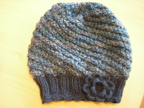 Selve luen er strikket i Meranogarn fra Online. 100% polyacryl, veldig mykt og godt. Nydelig mix av jeansblå/turkisblå farger. Vrangborden er strikket i Nepalgarn fra Drops design (jeansblå), 65% ull og 35% alpaca. Blomst er laget som brosje med nål bak.