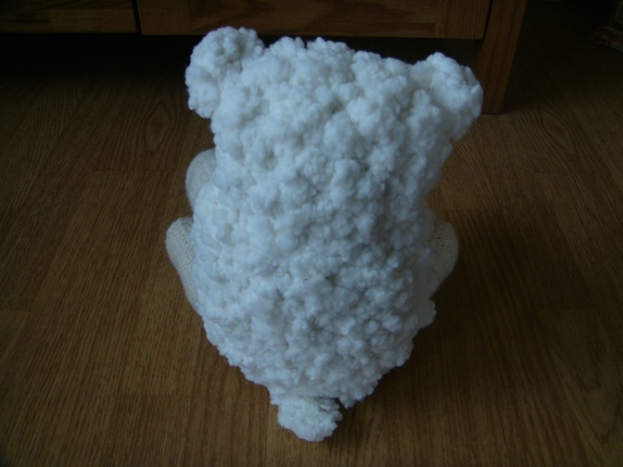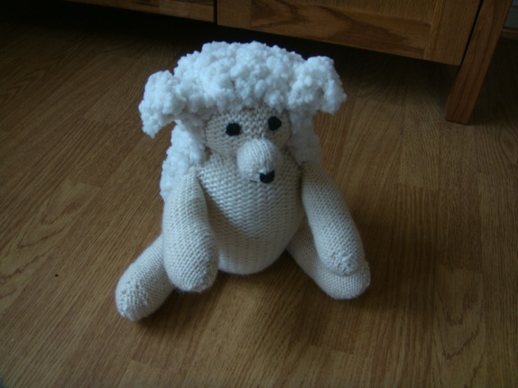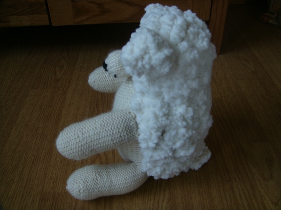 Sauen er ca 26 cm lang.Han er strikket i oda garn (50% ull/50% akryl) Pelsen er strikket i Emu ( 100%polyamid) Håndvask