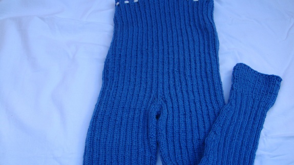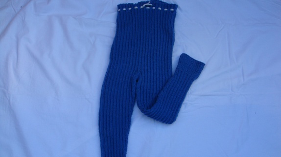 Strikket i ribb.Kan brettes opp på bena.Sitter godt etter kroppen. Størrelse 4 år.