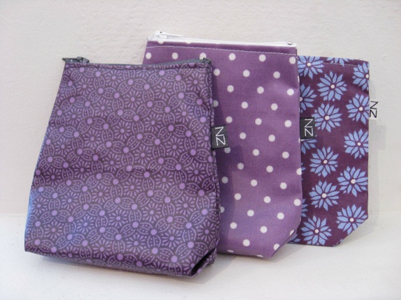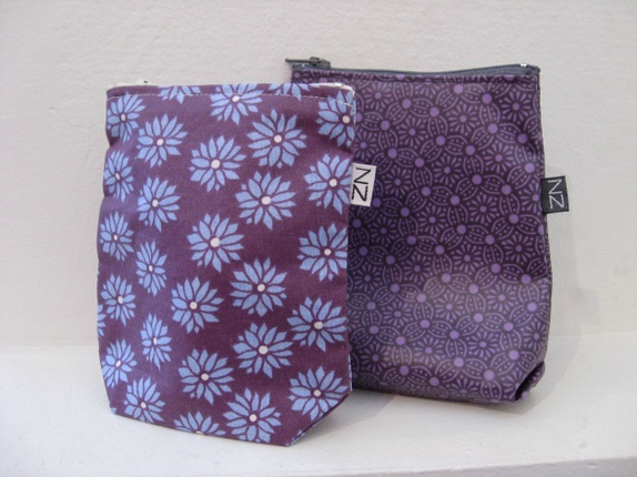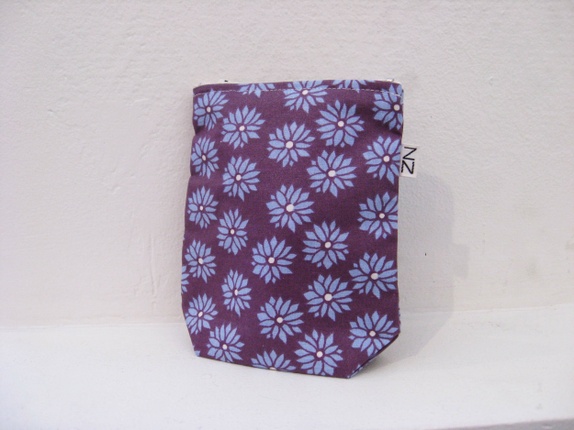 Liten lilla pung med lysere lilla blomster som har plass til de små viktige tingene: penger, mobil og nøkler og slikt.