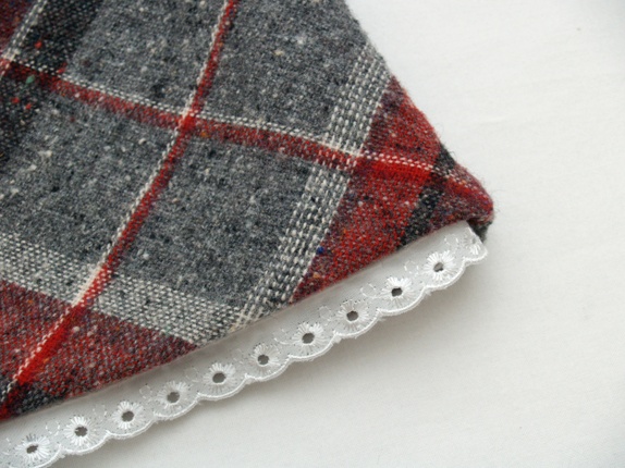 Penkjole i ren ull, sydd av et dameskjørt. Helforet med tynt, nytt bomullsstoff som er kantet med en blonde som titter frem nederst under kjolekanten. Kjolen er pyntet med en vevd bomullsblonde, en liten satengsløyfe og perlemorsknapper.