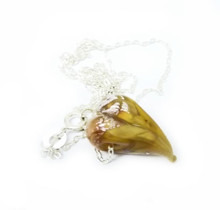 Et lite nydelig håndlaget gyllent lampworkhjerte, ca 2,0 cm. Det henger sølv lenke.