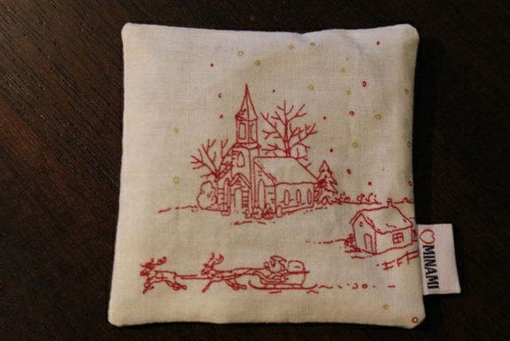 Lavendelposen har bunnfarge i offwhite med motiv i rødt - kirke og julenisse med reinsdyr. Posen har en bakside i offwhite bomull stoff.