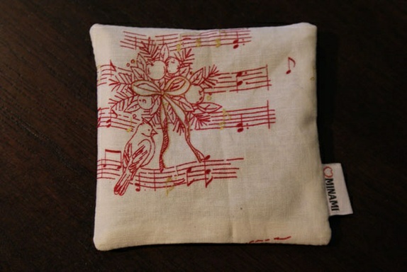 Lavendelposen har bunnfarge i offwhite med motiv i rødt - Krans med noter og fugl. Posen har en bakside i offwhite bomull stoff.