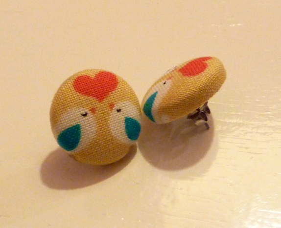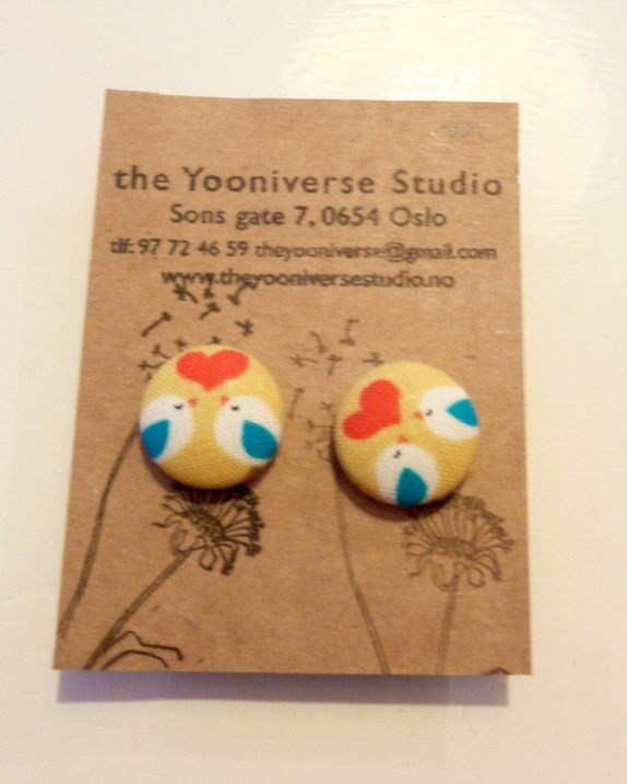 Runde stofftrukket øredobber 19mm. Lovebirds på gul bakgrunn.
