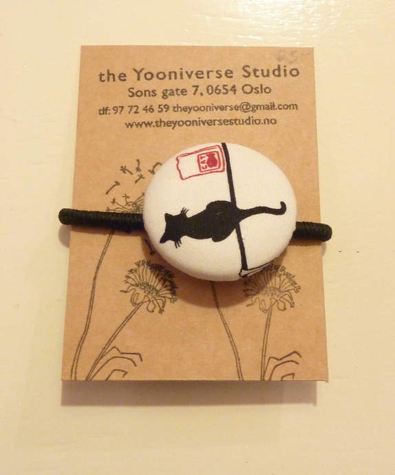 En stor (38mm) stofftrukket hårstrikk med tykt strikk som passer for en voksent hår. Svart katt på hvit bakgrunn.