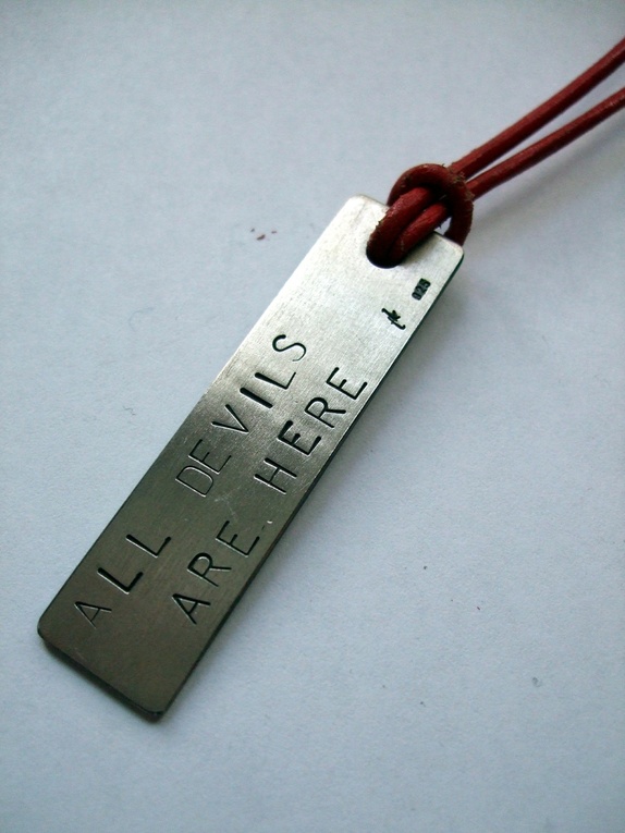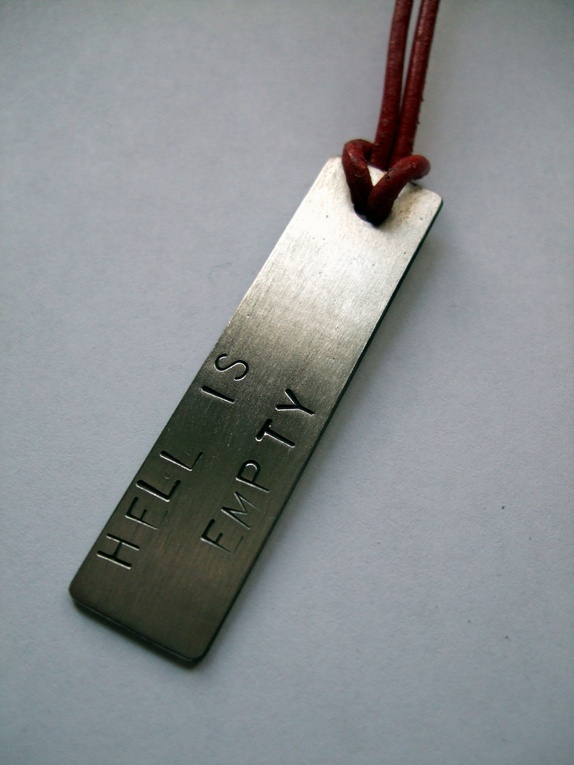Halssmykke i sølv med lærsnor. Sitat fra Shakespeares "The Tempest".