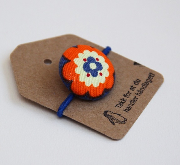 Selve strikken er ca 8 cm rundt, og den stofftrekte pynten 2,3 cm i diameter.
