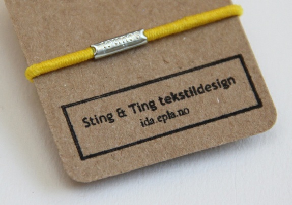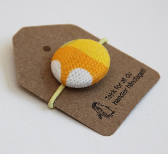 Selve strikken er ca 8 cm rundt, og den stofftrekte pynten 2,3 cm i diameter.