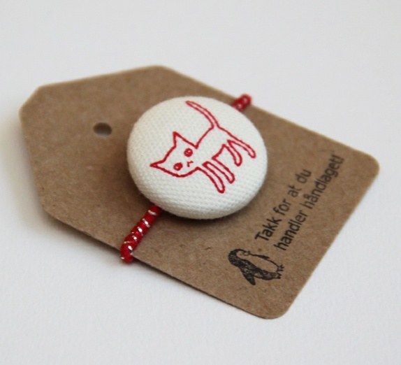 Selve strikken er ca 8 cm rundt, og den stofftrekte pynten 2,3 cm i diameter.