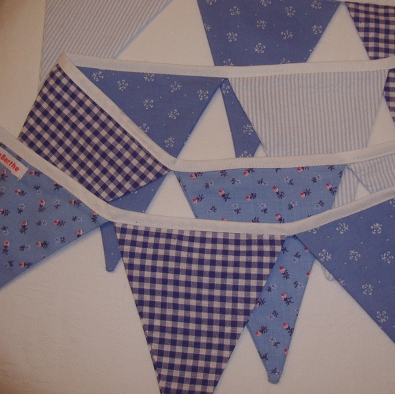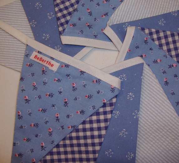 Vimpelrekke sydd i div. blå/hvite bomullstoffer. 175 cm lang, 12 stk. vimpler 13x16,5 cm. Passer godt som pynt på barnerommet.