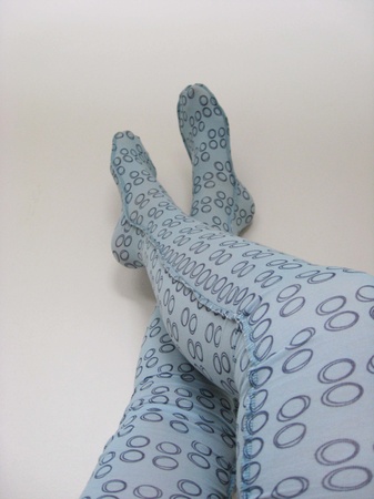 Lange, deilige knestrømper som rekker godt over knærne. De er sydd i lysblå bomullsjersey med sirkler i en dus mellomblå farge. Knestrømpene er fasongsydd med en dekorativ overlocksøm på utsiden og i avslutningskanten oppe.