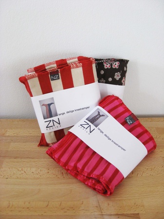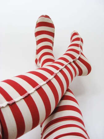 Lange, deilige knestrømper som rekker godt over knærne. De er sydd i stripete bomullsjersey i hvitt og rødt. Knestrømpene er fasongsydd med en dekorativ overlocksøm på utsiden.