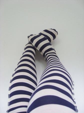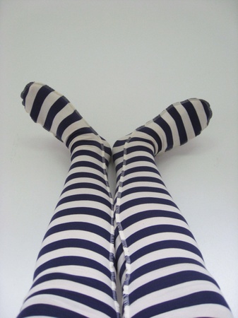 Lange, deilige knestrømper som rekker godt over knærne. De er sydd i bredstripete bomullsjersey i off-white og blått. Knestrømpene er fasongsydd med en dekorativ overlocksøm på utsiden.