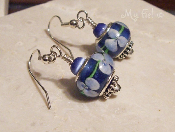 Nydelig lampwork perler i blått med blå blomster, sølvkjerne og tigerøye. Øredobbene er ca 2 cm lange fra kroken slutter.