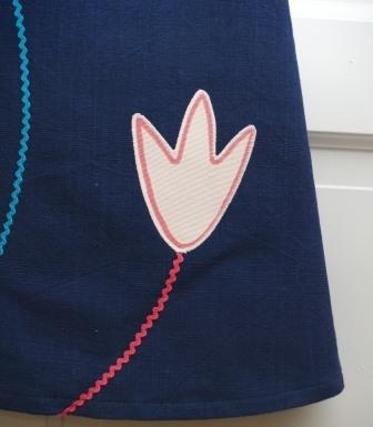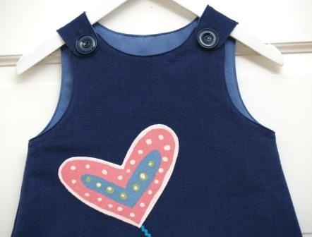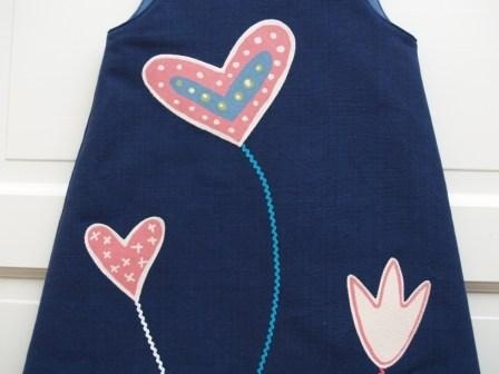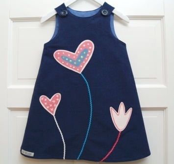 Søt og solid hengslekjole, sydd av en ensfarget, blå gardin i kraftig, litt grovt bomullsstoff. På forsiden er kjolen pyntet med to hjerter og en blomst som står på svaiende stilker av kroklisser i ulike farger. Store, mørke blå knapper i selene. Kjolens overdel er foret med et ensfarget blått, litt blankt bomullsstoff.