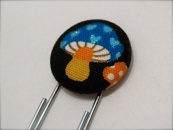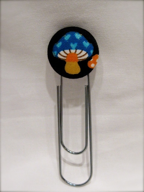Bokmerke laget av stor knapp trukket med japansk stoff.