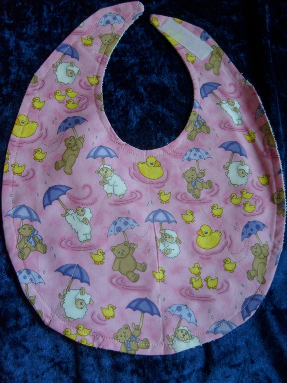 Babysmekke i godt bomullstoff med hvit plastfrotte på baksiden. Dette hindrer at gullungen blir våt på klærne under smekka.Tåler mange, mange omganger i vaskemaskinen.Lukkes med borrelås.Smekka Måler 17 cm. ned fra halsgropen.