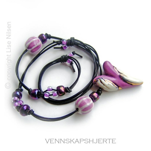 Montert i håndlagde porselensperler, flassperler og på lærsnor med kjærlighetsknuter som du kan flytte.