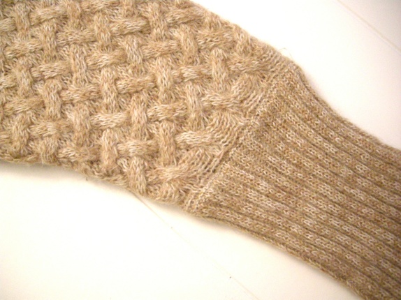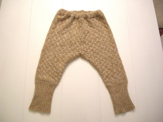 Nydelig barnebukse av angora, lammeull og 20% akryl Redesignet av en beige flettestikket genser.Ca 3-4 årmåler 63cm i hel lengdeliv (målt flatt på en side) 25cm strekkes til 35cm