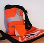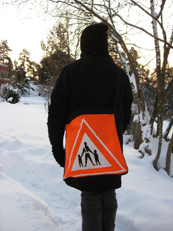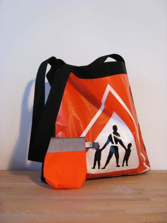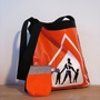 Gammelt skolepatruljeflagg i oranjse med motiv i sort og hvitt har fått nytt liv som skulderveske. Selve vesken er i et kraftig vevd, syntetisk materiale som er belagt med plast på utsiden. Hanken er et slitesterkt, vevd nylonbånd som også fungerer som en forsterkning på sidene og i bunnen.