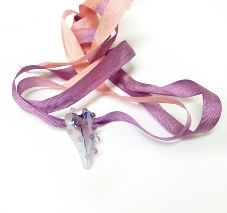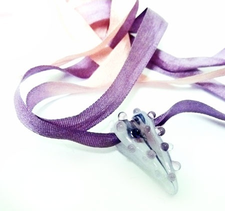Lite, ca 2 cm håndlaget lampworkhjerte i ekte slorlett silkesnor.