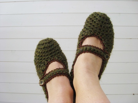 Deilige, varme tøfler heklet for hånd i mosegrønt, tykt garn i en alpacablanding. Tøflene har en vakker liten metallknapp på siden og en kant i kobberfarge.