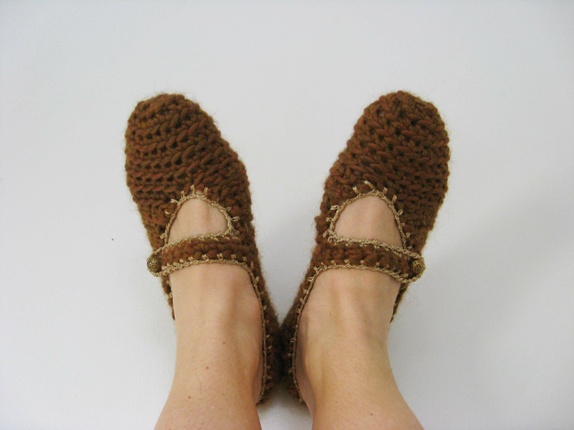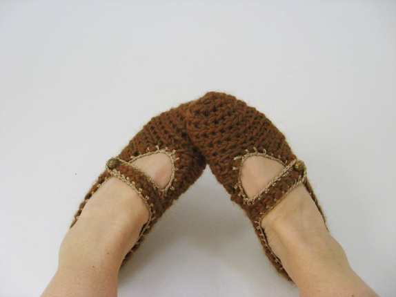 Deilige, varme tøfler heklet for hånd i rustfarget, tykt garn i en alpacablanding. Tøflene har en vakker liten gullknapp på siden og en kant i gull.