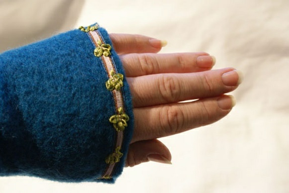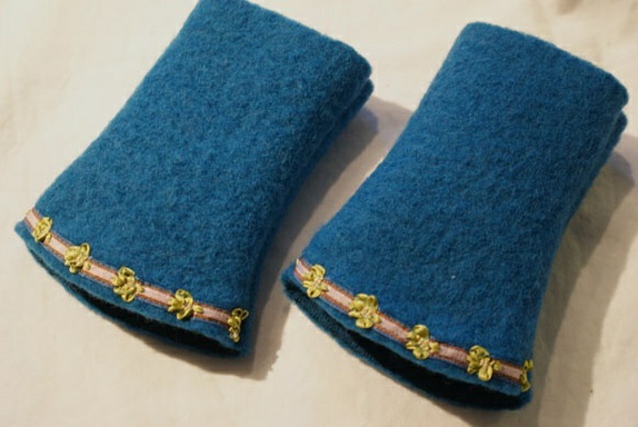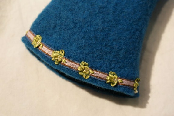 Turkis pulsvarmere i ullfilt med påsydd bånd med blomster på den ene siden.