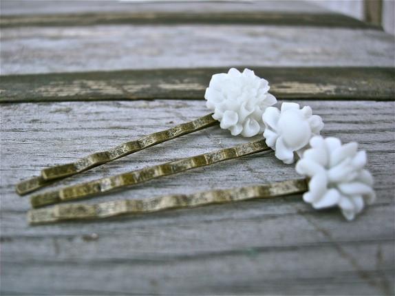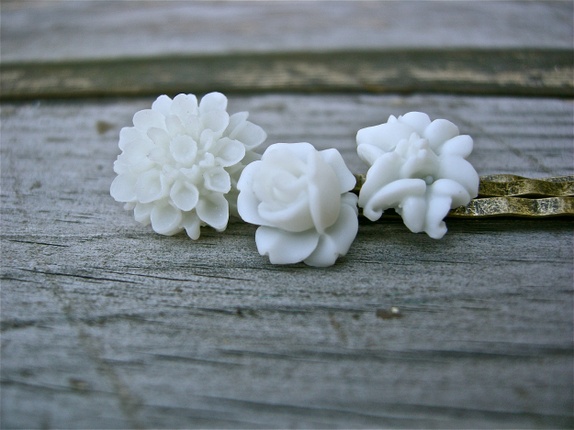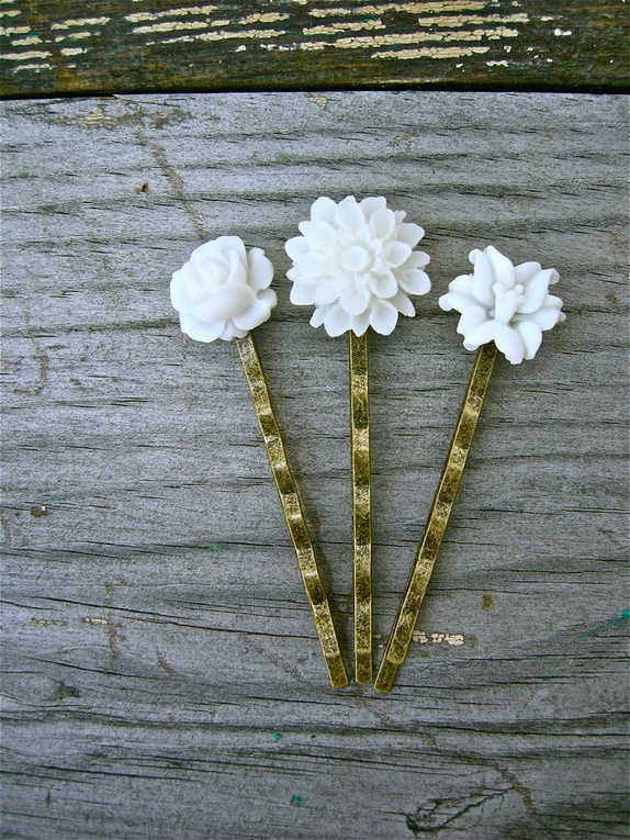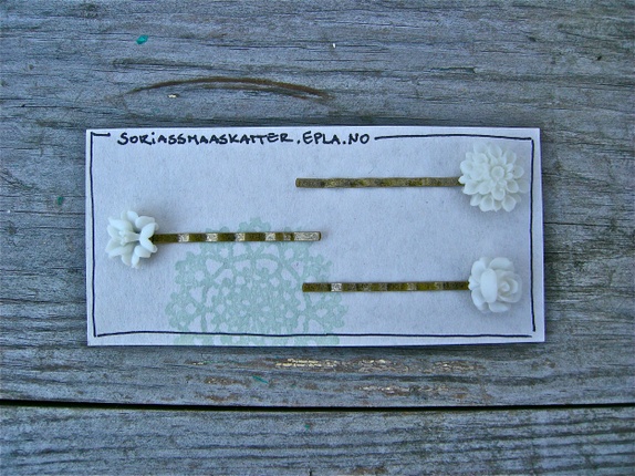 3 nydelige hårspenner i hvitt.Hårnål i oksydert kobber med akrylblomster.Limet er profesjonelt smykke lim og etterpå lagt i herder. Hver spenne måler ca 5,5 cm.