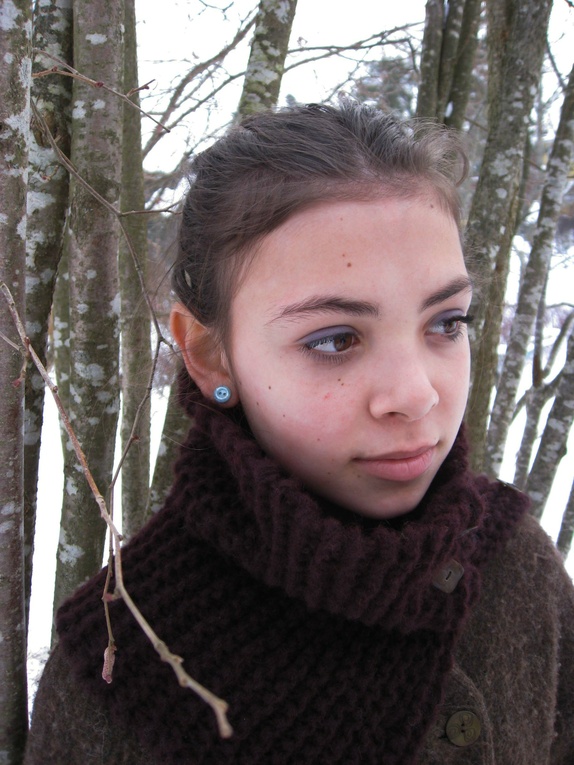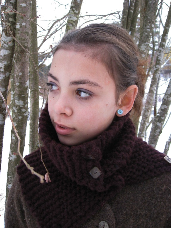 Deilig hals strikket i brun, tykk alpaca. Halsen har 5 store, kvadratiske perlemorsknapper og kan åpnes. Den kan også trekkes opp på hodet slik at den fungerer som en hette.