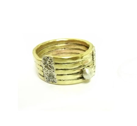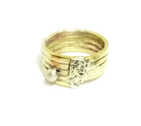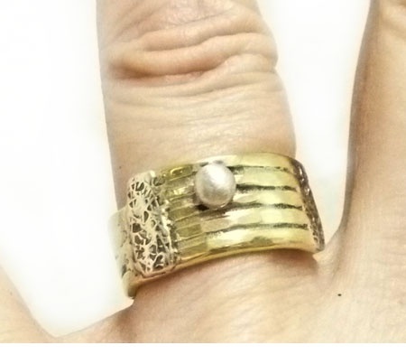 Håndlaget ring i bronse, hamret og påloddet sølv.Str. 60, tøff som langfingerring.