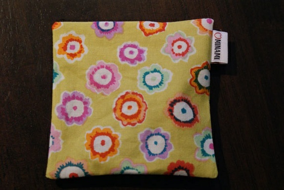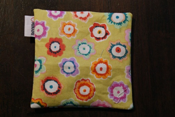 Fargen på lavendelposen er gul/grønn i bunnfarge med motiv av blomster i ulke farger. Det er brukt samme stoff på begge sider.