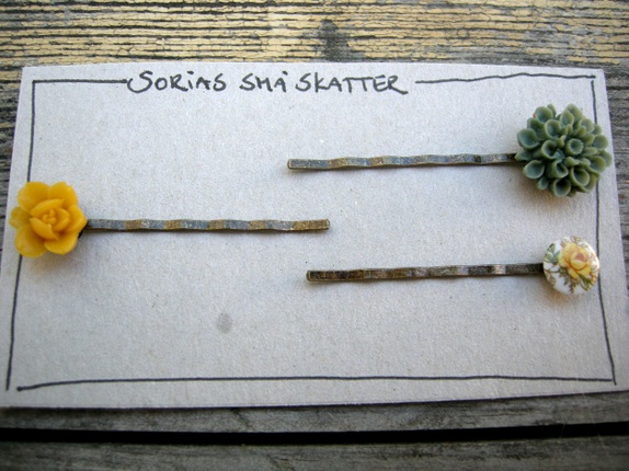 3 nydelige hårspenner i grønt og gult.Hårnål i oksydert kobber med akrylblomster og glass cabochon.Limet er profesjonelt smykke lim og etterpå lagt i herder. Hver spenne måler ca 5,5 cm.
