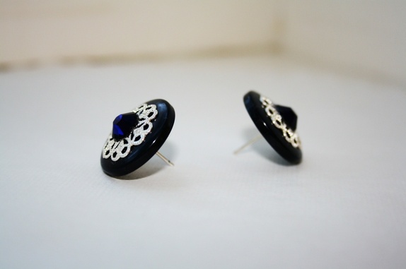 Marine-blå øredobber med sølvfarget pynt og mørkeblå, glitrende swarovski-stener.