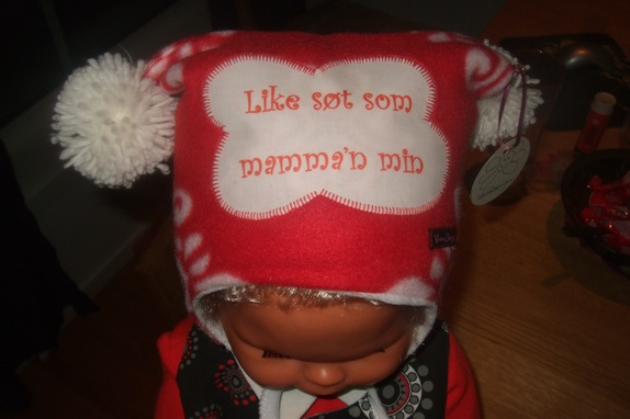 Kjempestilig barnelue i polarfleece foret med velour og knyting under haken med teksten : "Like søt som mamma'n min".Ca 1 - 2 år, måler ca 44cm i omkrets, noe tøyelig.Sitter godt på hodet og går god ned over ørene...