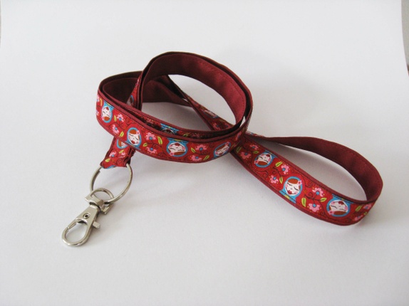 Nøkkelbånd sydd av nydelig, vevd bånd med skråbånd på baksiden. Båndet er dyp rødt med mønster av babuschkahoder og blomsterranke i turkis, rosa og grønt.