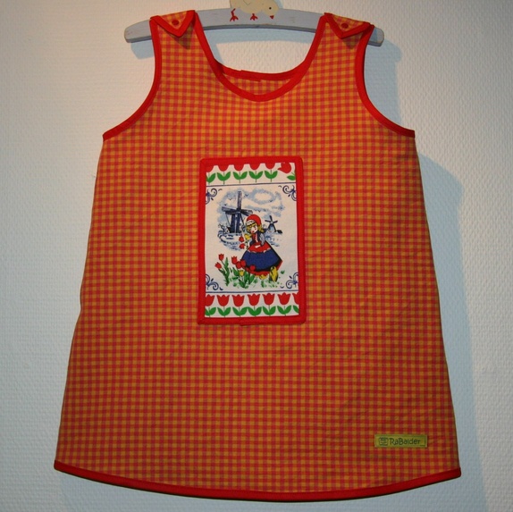 Kjole i størrelse 3 år sydd på bestilling. Stoffet er gul-og- rosarutete kraftig bomull fra loppemarked. Kantet med røde skråbånd. Jeg har mulighet til å sy flere slike.