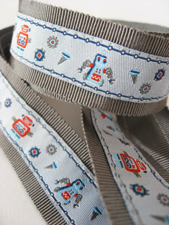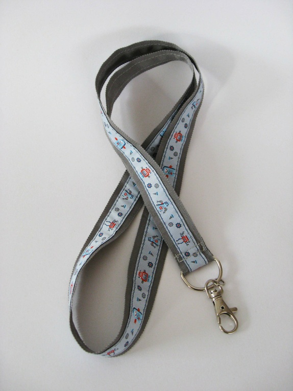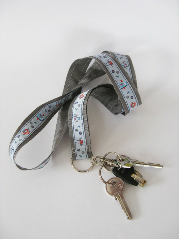 Nøkkelbånd sydd av nydelig, vevd bånd med grått ripsbånd på baksiden. Båndet er lyseblått med mønster av små blå og røde roboter.