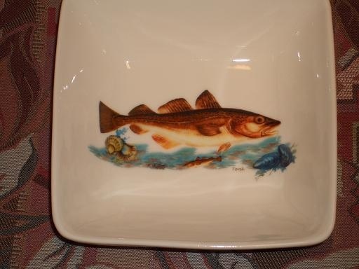 Firkantet suppeskål (15x15cm) m.innbrent motiv av torsk. Kan vaskes i maskin