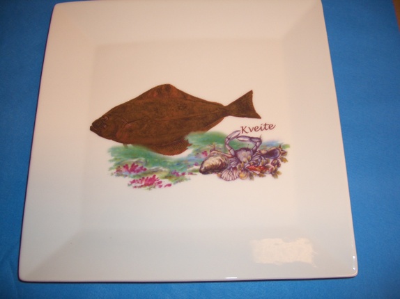 Firkantet (20x20cm) porselenstallerken med innbrent motiv av Kveite. Kan vaskes i maskin